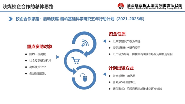 秦嶺計劃預計五年內投入協同創新資金30億元,面向全球高等院校、科研院所、創新技術企業和創新技術團隊,以共享知識產權為前提,資助高校等專職研發機構科研人員開展基礎科學研究,孵化或遴選具有明確市場應用前景的技術研究項目進入陜煤集團科技創新體系中開展后續工作。重點資助領域包括煤炭、化工、新材料、新能源、新一代電子信息、低碳綠色、裝備制造、生命健康等八個方向。