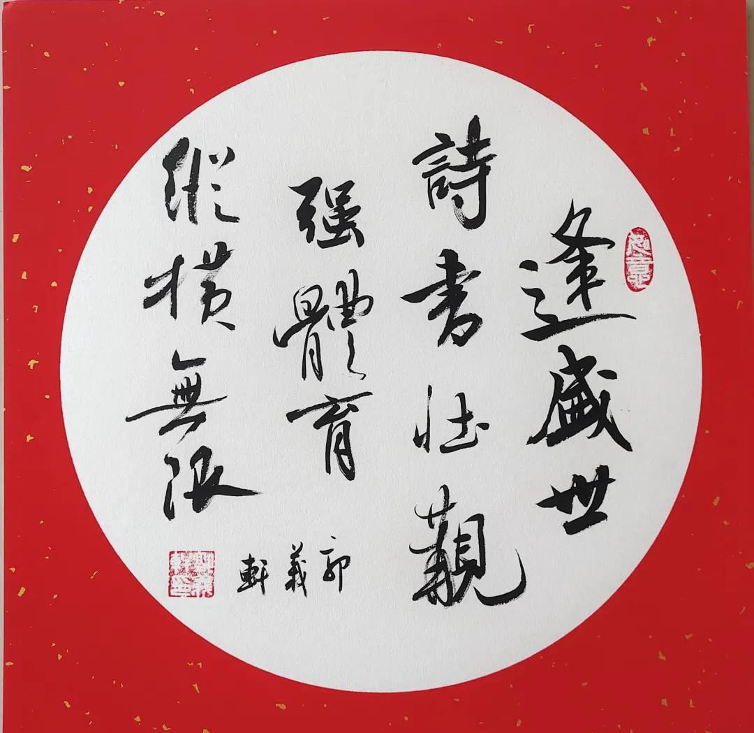 逢盛世,詩書壯觀。強體育,縱橫無限。(行書)